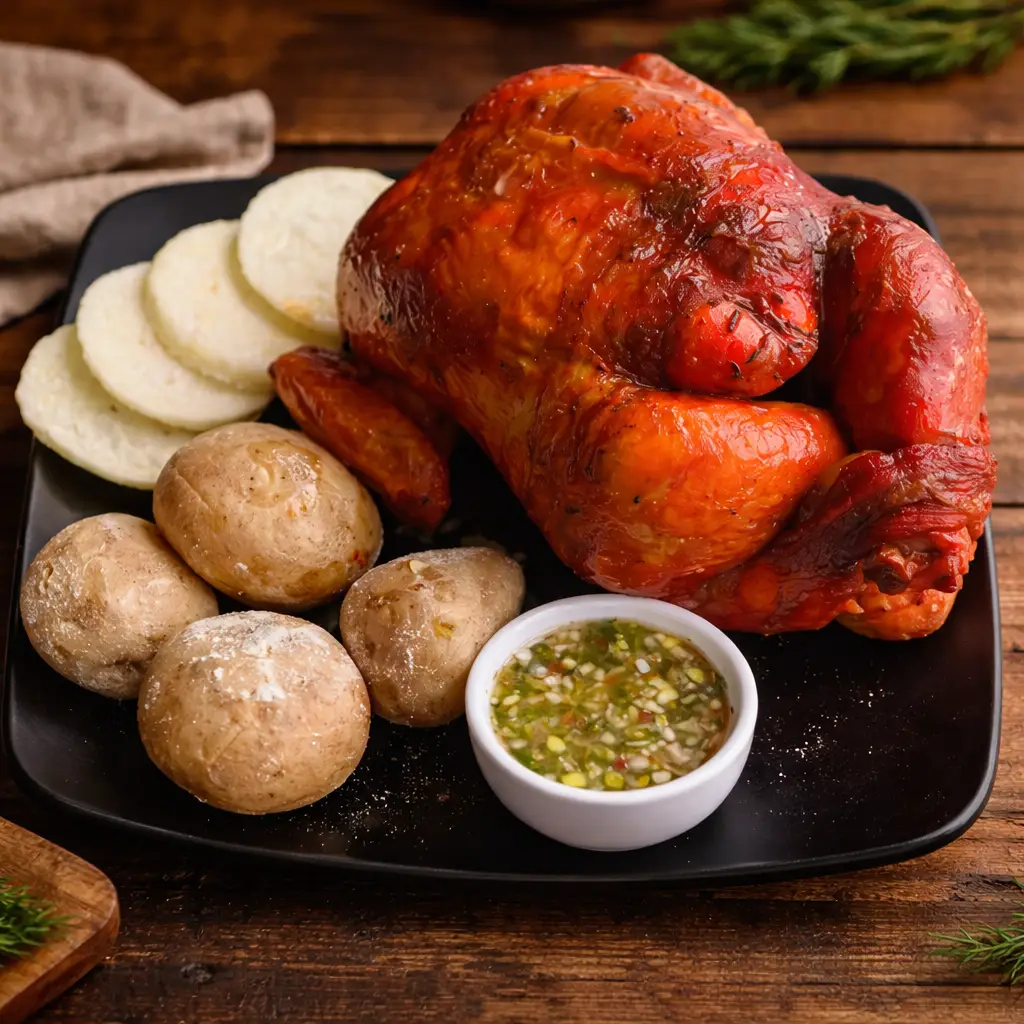 Pollo asado completo de 8 presas, jugoso y bien dorado, acompañado de papa salada y arepa. Ideal para compartir en familia y disfrutar un sabor tradicional y casero.