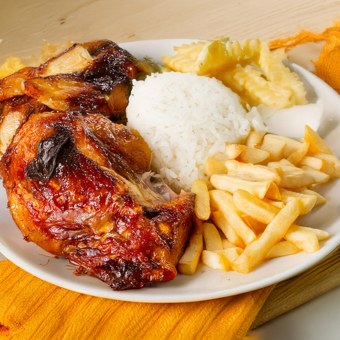 Bandeja de pollo asado con 2 presas jugosas y bien doradas, acompañadas de papa francesa, arroz, yuca y ensalada fresca. Una opción completa, abundante y perfecta para disfrutar un almuerzo tradicional con todo el sabor del pollo asado.