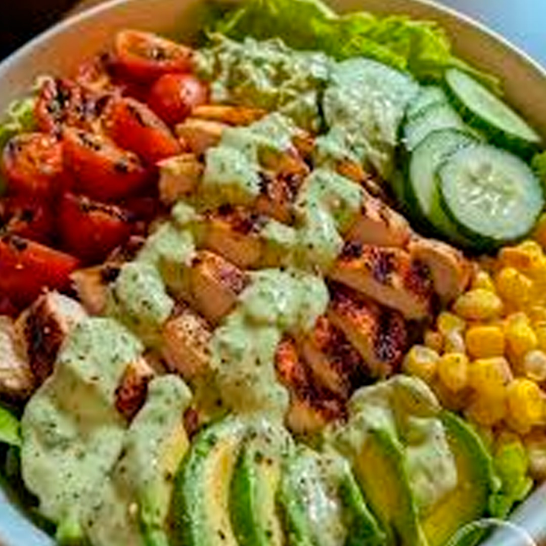 Bowl fresco de pollo con arroz blanco, vegetales, aguacate y pechuga apanada, acompañado de una deliciosa salsa. Una opción equilibrada, fresca y llena de sabor.