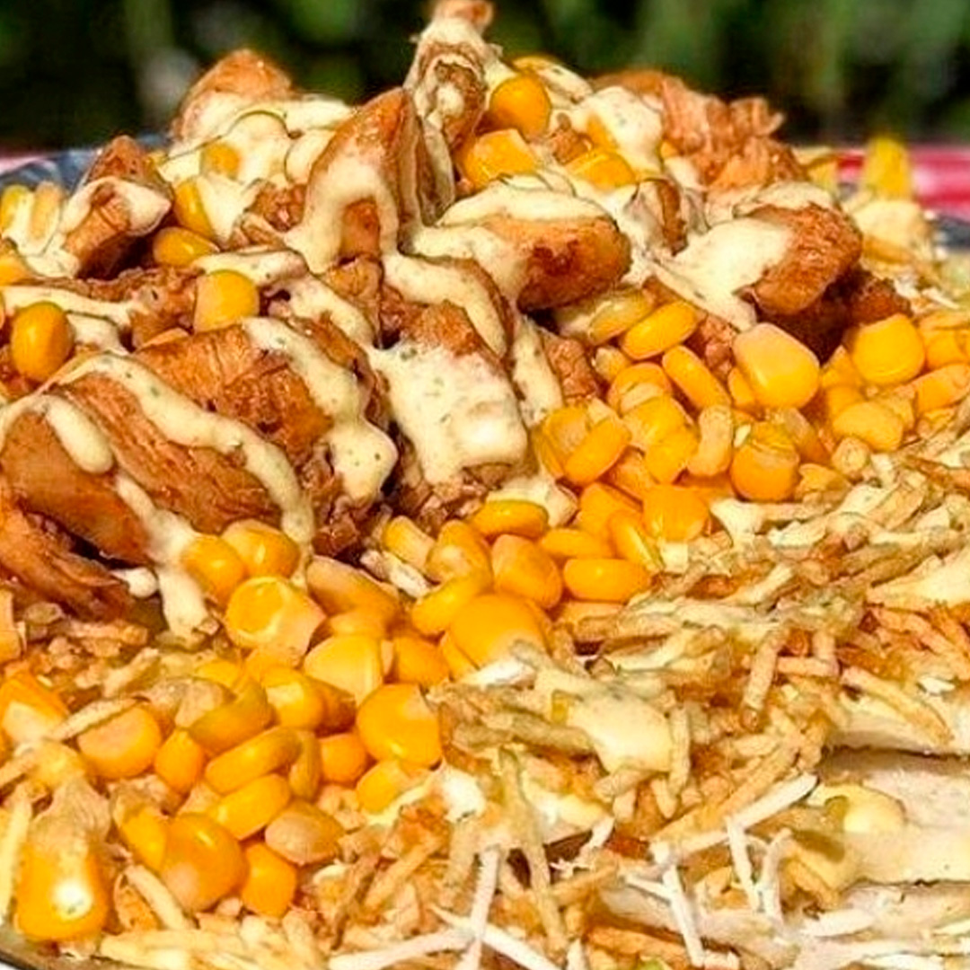 Mazorcada con pollo y papa francesa, una combinación deliciosa y práctica para quienes disfrutan comidas rápidas con buen sabor.