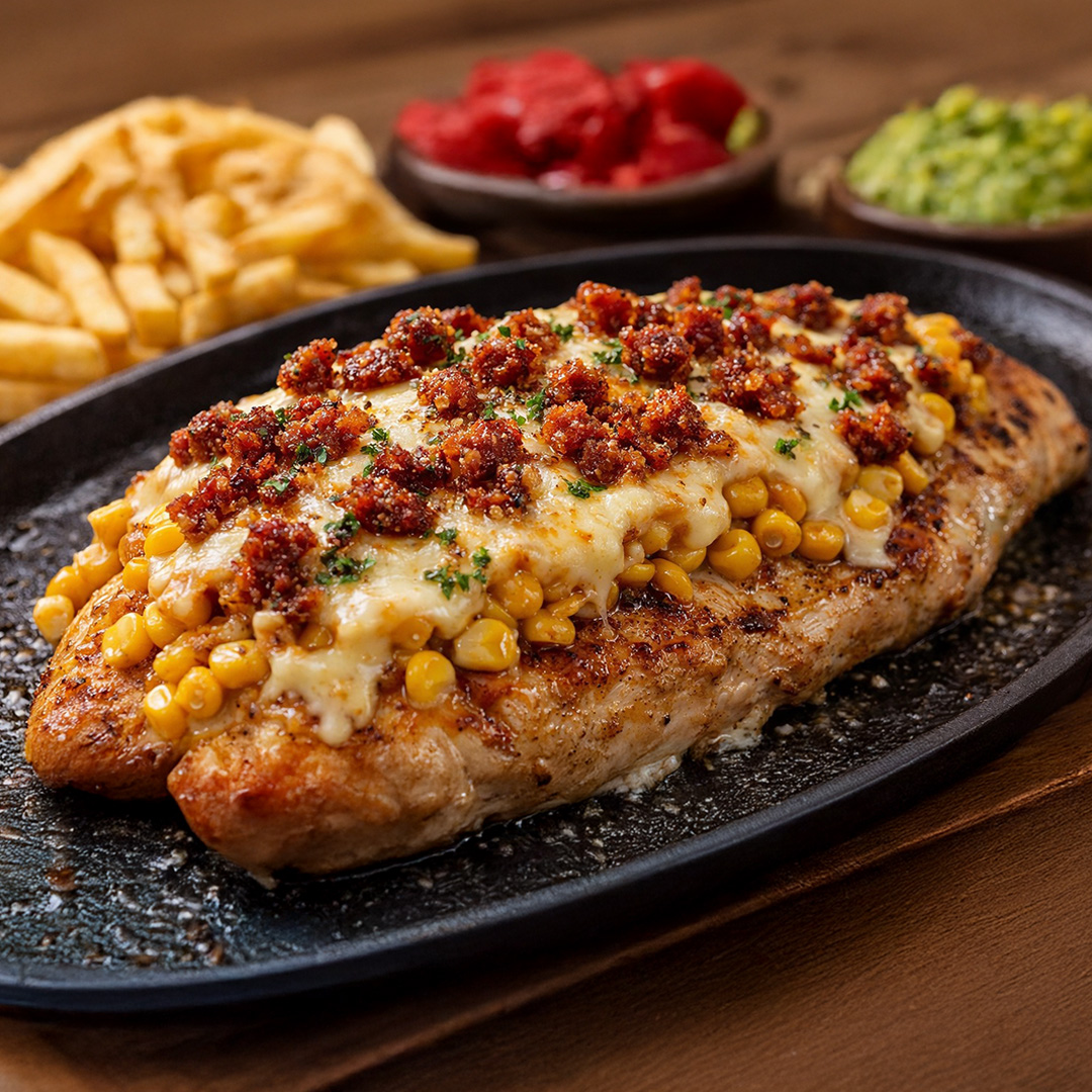 Pechuga ranchera de 350 gramos, jugosa y bien sazonada, acompañada de queso gratinado, chorizo y mazorca. Incluye papa, arroz, yuca y ensalada para una experiencia completa y abundante.