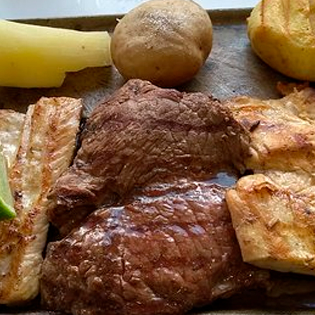 Tabla mixta con selección de carnes y pollo, acompañada de papa francesa, arroz, yuca y ensalada. Perfecta para compartir y disfrutar diferentes sabores en un solo plato.